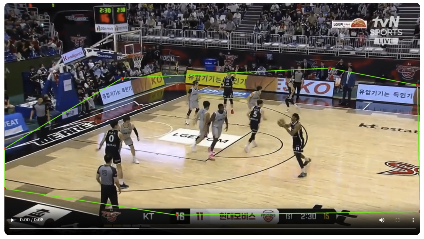 배경 농구 경기를 분석하여 선수의 움직임을 추출하기 위해서는 우선 농구 코트를 ROI(Region of Interest)로 설정해야 한다. 그래야만 관중과 선수들을 구분할 수 있기 때문이다. AI 분석 방법이 많은 GPU를 요구하고 느린 관계로 OpenCV를 이용하여 기본적인 ROI를 구현하는 부분을 테스트했다. 고정된 카메라에서는 정해진 ROI를 사용할 수 있지만, 방송 중계 화면은 카메라 이동이 빈번히 일어나고 선수들이 움직여 코트의