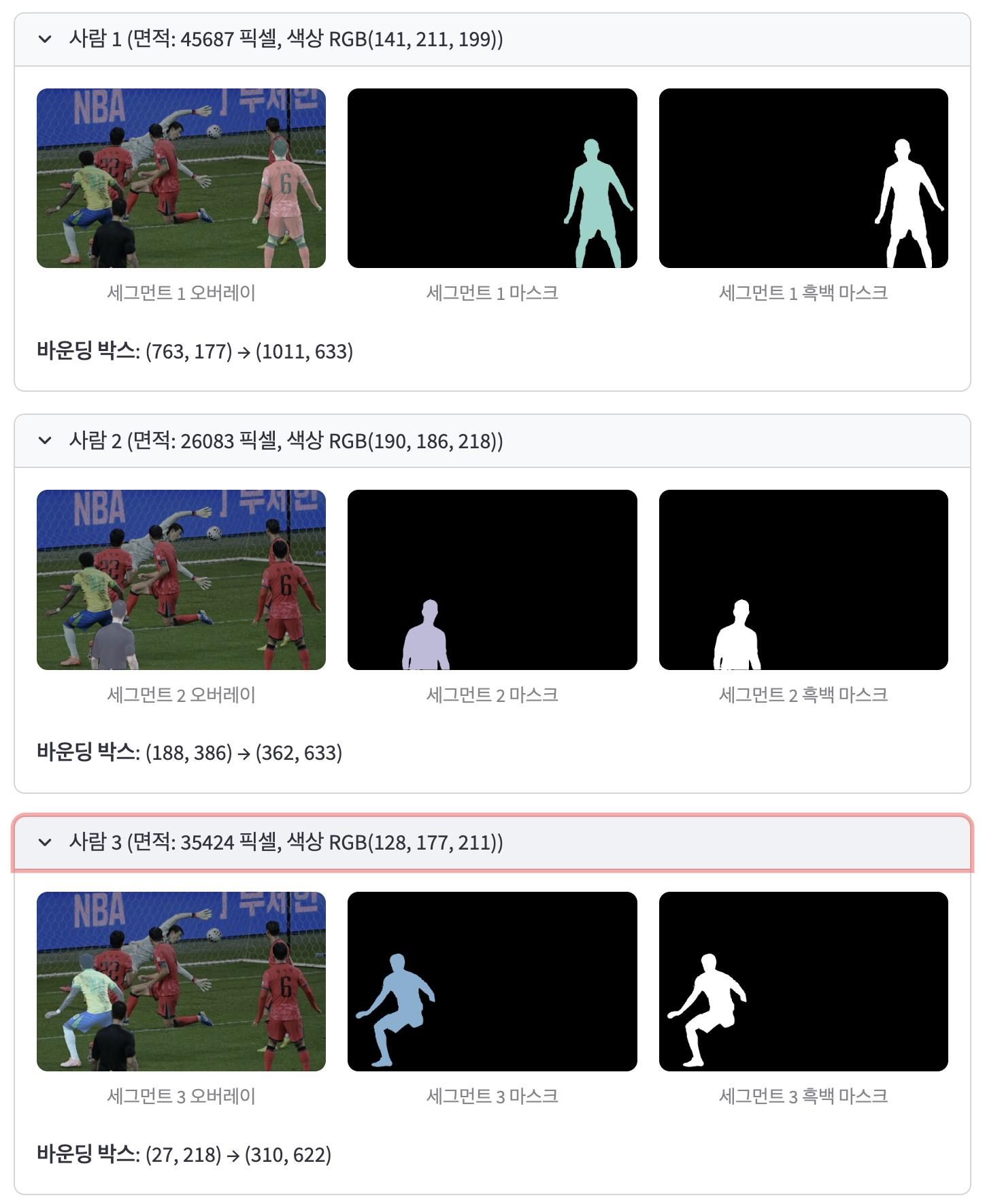 지난번 글에서 Supervision과 ByteTrack을 이용해서 도로에서 차량을 찾고(Yolo) 트래킹(ByteTracking) 하는 예제를 만들어 봤는데, 이글은 그 연장선에서 목표를 찾아서 찾아서 박스만 두르는 것이 아니고 정확한 형상을 추출(세그멘테이션)하는 기능을 구현하기 위하여 Segment Anything Model (SAM)과 YOLOv8을 결합하여 사람과 공(sports ball) 객체를 정확하게 탐지하고 세그멘테이션하는 시스템을 구현해봤다. UI는 Streamlit을 활용했다.